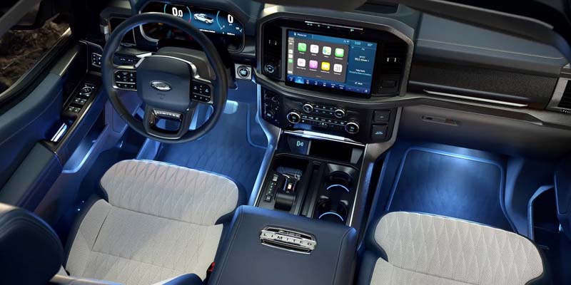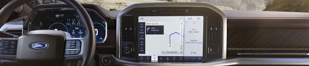 Depending on the trim you choose, the F-150 can have interior features like a leather steering wheel, a flow-through center console with a stowable floor shifter, and dual-zone electronic automatic temperature control. The F-150 comes standard with a 4-inch productivity screen but can sport a 12-inch digital productivity screen for better viewing. Other luxury details in the F-150 can include a heated steering wheel for warm hands and a wireless phone charger you can pair with wireless phone connectivity to remove the need for charging and audio cables while driving.