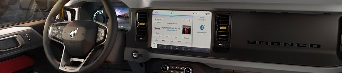 Step inside the Bronco's rugged yet refined interior, where durability meets comfort. The spacious cabin is designed to withstand the elements while providing modern amenities and convenience. From available leather-trimmed seats to the intuitive SYNC® infotainment system with touchscreen display, the Bronco keeps you connected and entertained on every adventure.