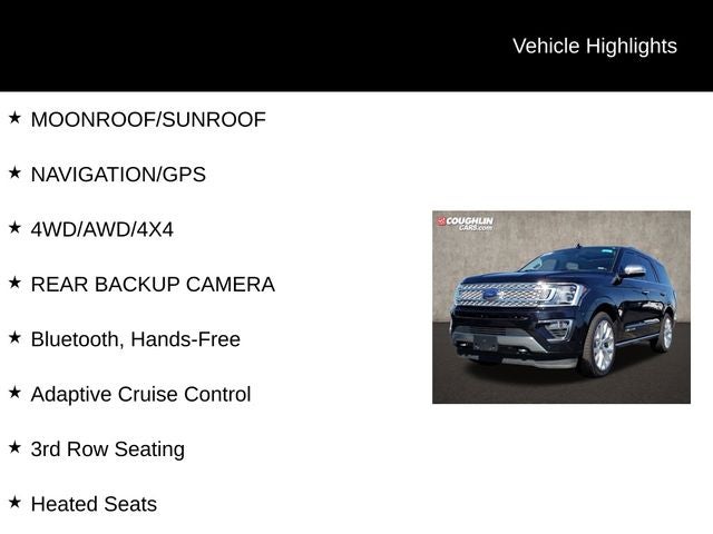 We invite you to experience the exceptional quality and performance of this 2019 Ford Expedition Platinum. Please call or e-mail first for the best and quickest information. Visit www.coughlinpataskalaford.com to see more of this store's new and used vehicle inventory for sale. Price excludes tax, title, license and document fee. While we make every effort to prevent pricing errors, key stroke and human errors do occur. Please contact dealer for details.