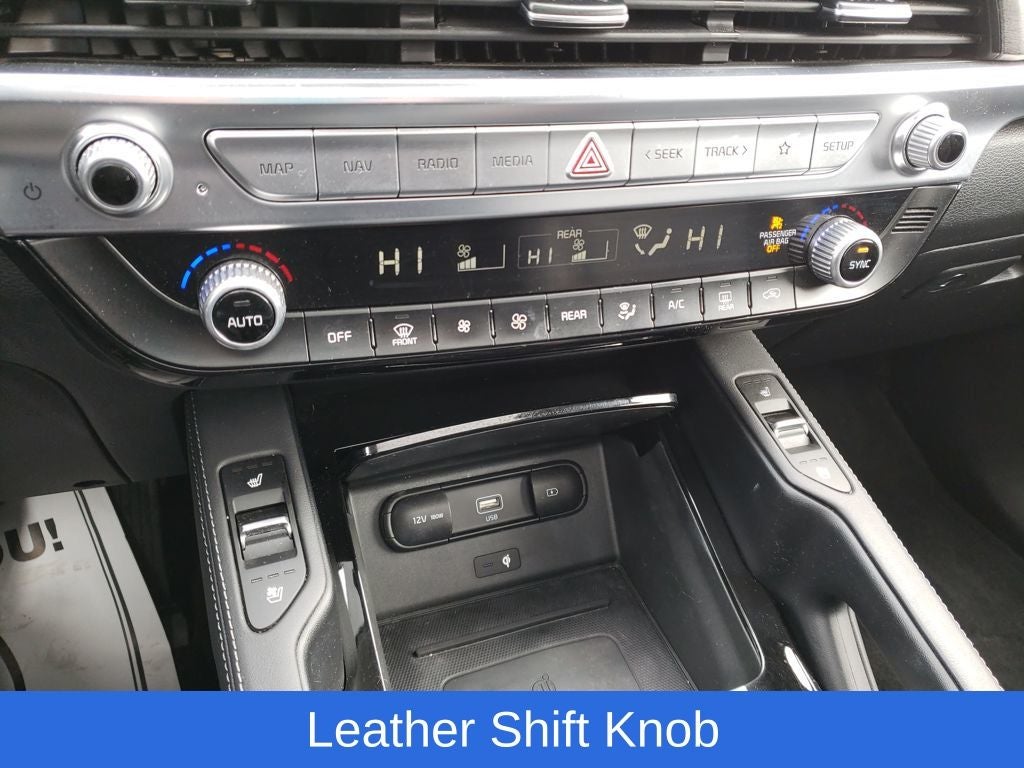 The spacious and versatile interior of the Telluride EX offers seating for up to 8 passengers, with the added convenience of 2nd Row Captain Chairs and a Power Liftgate. The premium leather-wrapped steering wheel and shift knob, along with the heated and ventilated front bucket seats, provide a luxurious touch to the cabin.