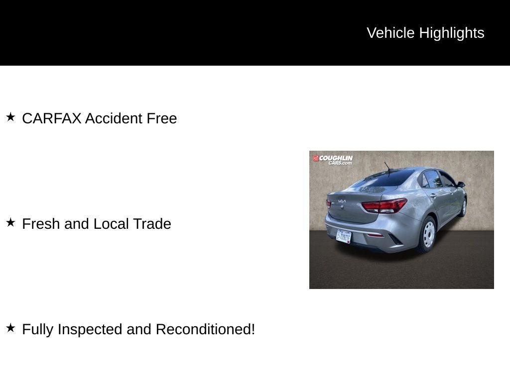 Whether you're seeking an efficient, well-equipped daily driver or a practical and affordable compact sedan, this 2022 Kia Rio S is an exceptional choice. Experience the difference for yourself and schedule a test drive today at Coughlin Kia of Lewis Center.